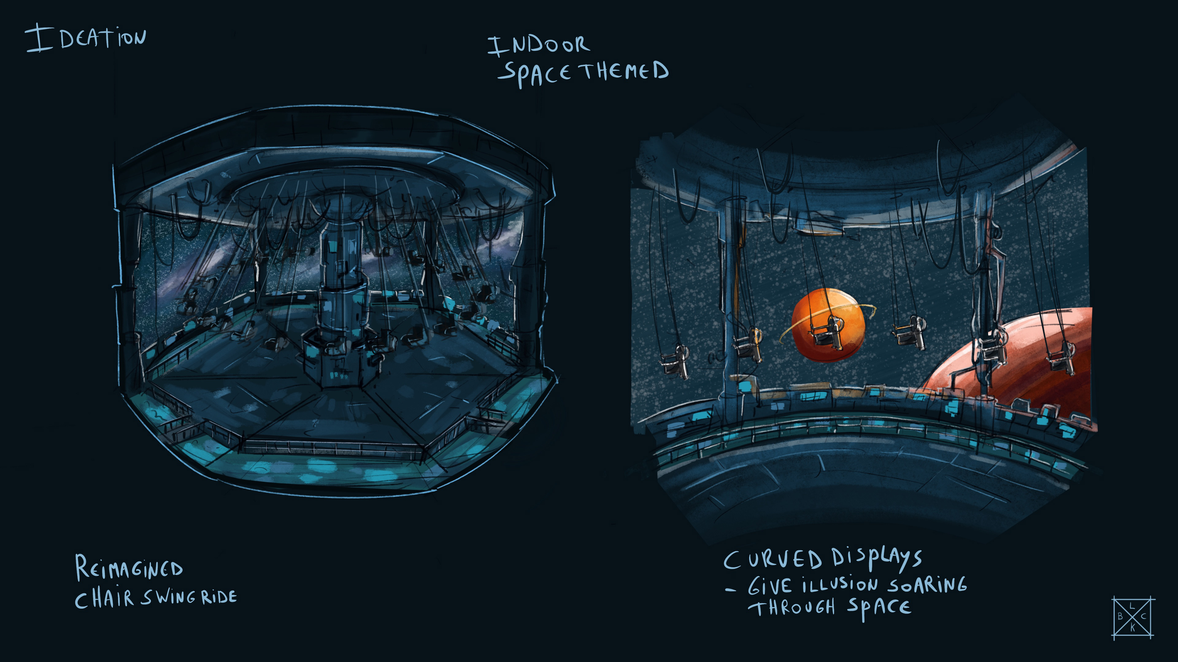 Most people are familiar with a chair swing ride. But what if you took this classic attraction indoors, surrounded it with 360° wraparound screens, and layered it with a space theme? I imagined a ride like this—an attraction that allows guests to soar through space and fully immerse themselves in an unforgettable flight.